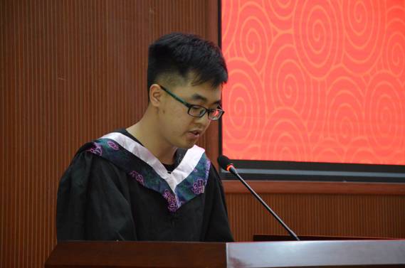 黄炀炀同学作为优秀毕业生代表对学院领导、老师表达了衷心感谢,对同学、朋友表达了恋恋不舍,面对即将踏入社会的新旅程,黄炀炀表明要不负期望,全力以赴,为学校争光添彩,同时也祝愿学弟学妹法考再创佳绩,祝愿法学院的明天更加美好。