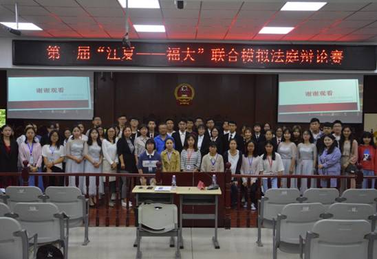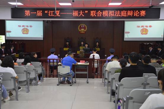 5月10日下午,法学院在大模拟法庭举办第一届“江夏—福大”联合模拟法庭辩论赛。法学院王鹏、周茂青、常琳老师,2015级辅导员陈笑霞老师,学生会主席陈俊统同学,团委副书记李宁悦同学,福州大学法学院辩论队,2018级全体同学到场参加。此次模拟法庭辩论赛由王鹏老师担任评委,曹思浩同学主持。