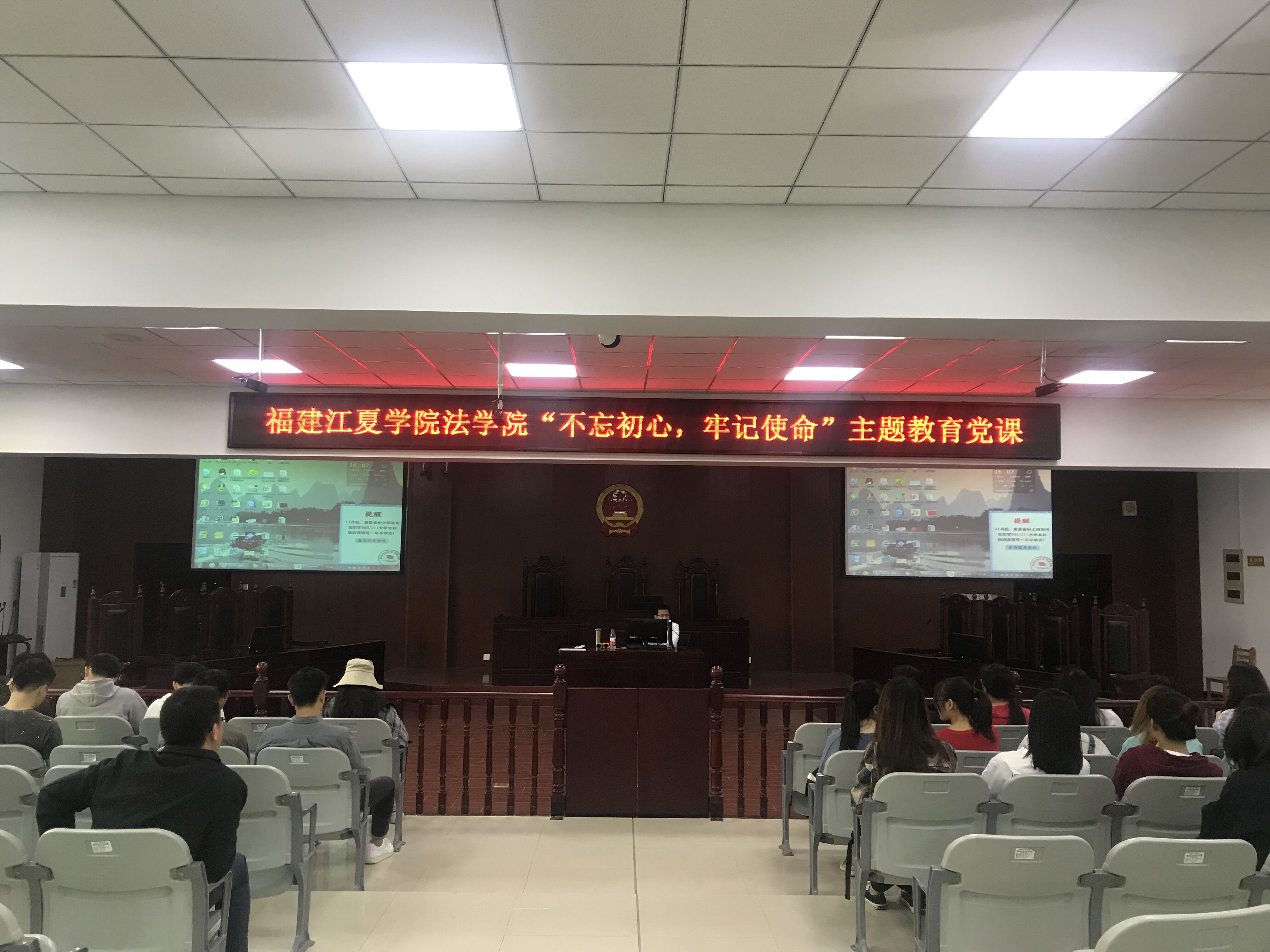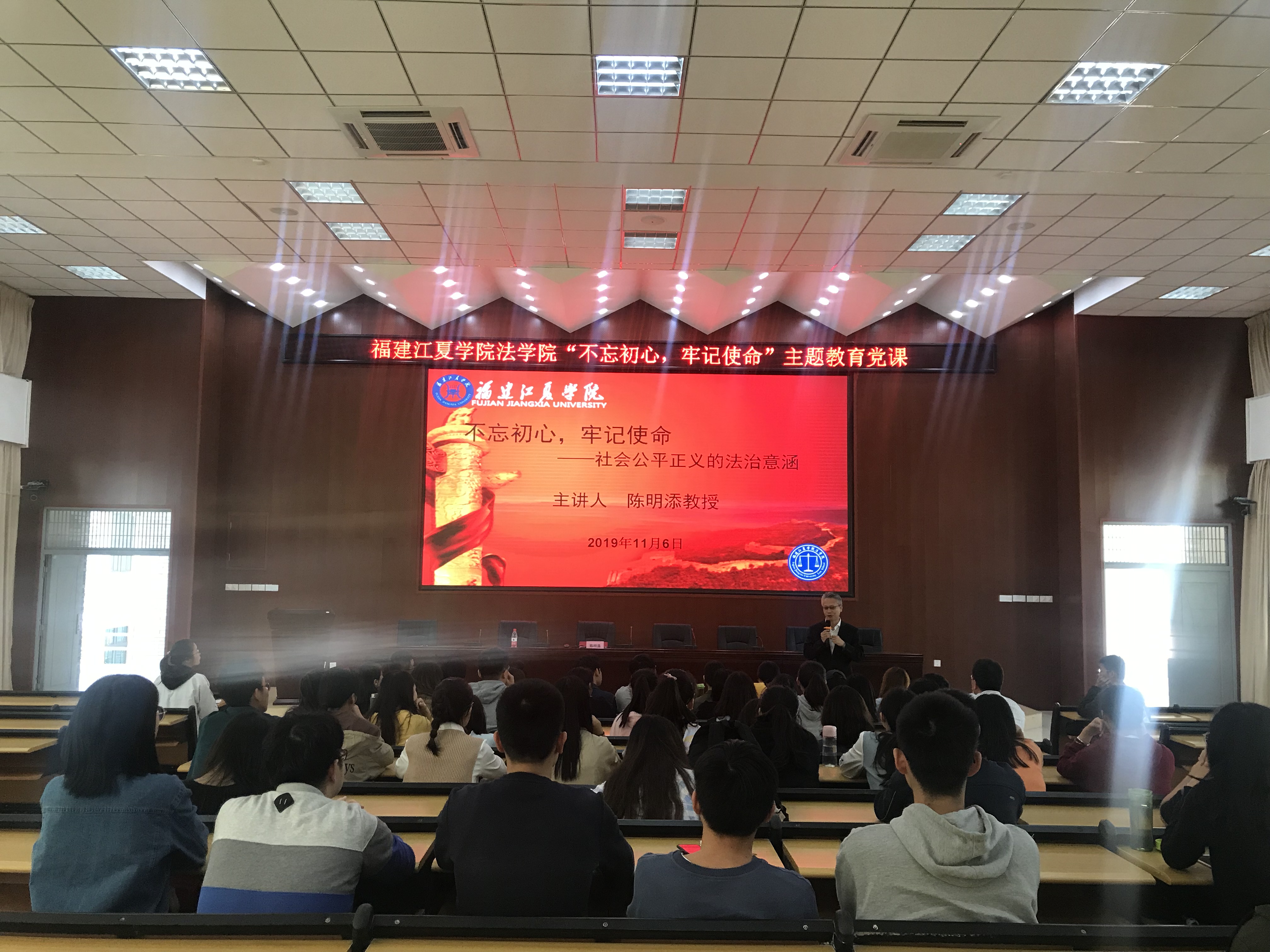 学院党委委员、院长陈明添以“不忘初心、牢记使命——社会公平正义的法治意涵”为题,围绕“社会公平正义法治的要求”阐述依法治国的目的;学院党委副书记陈恭健以“找差距,守规矩,严明党的纪律”为题,讲授加强党的纪律建设的明确要求,做合格党员;学院党委委员、福建台湾法律研究所常务副所长郭敏峰以“增强学习本领,提高写作能力”为题,讲授法科学生要加强综合素质培养,静下来多读经典,学会思考,提高书写能力;学院党委委员、副院长林贵文以“践行立德树人,做好职业规划”为题,讲授法学专业学生要树立社会核心价值观,强化责任担当,做好人生规划。