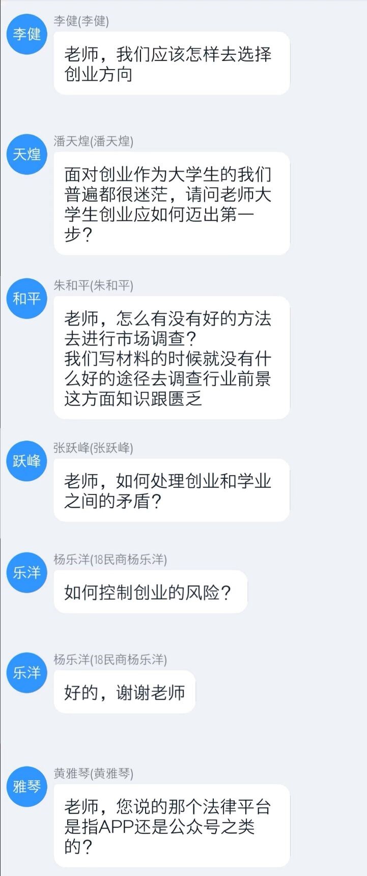 在提问环节,黄礼锵老师就法学专业和大学生创新创业的联系,与叶灯烽老师进行了深入的交流与探讨,同学们亦对在开展大学生创新创业项目时所碰到的问题向叶灯烽老师请教。叶灯烽老师结合自身经验,由浅入深,一一详细解答。