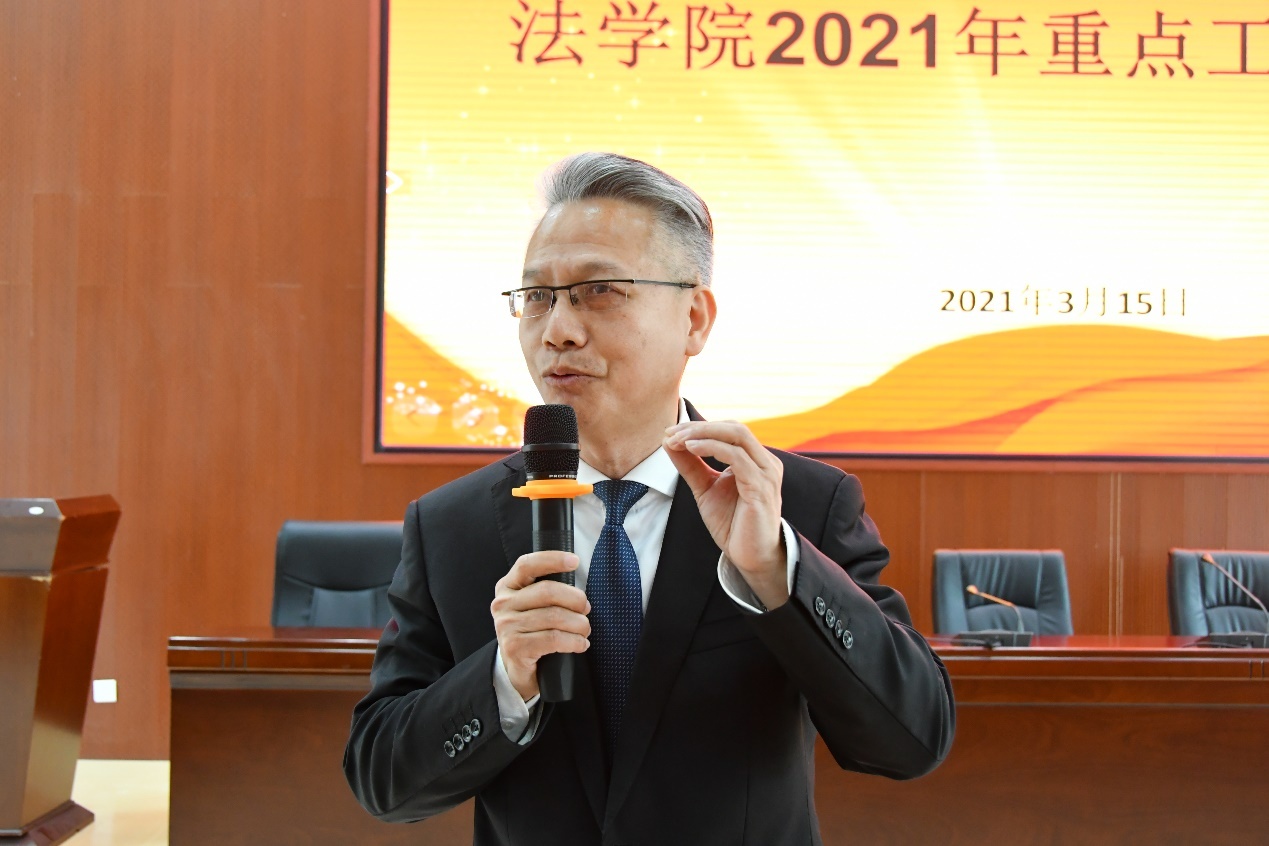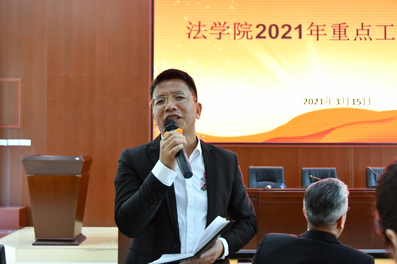 党委书记张湖北就做好法学院2021年重点工作提三点意见,一是正确认识学院中心工作的意义。按照学校2021年重点工作的部署,扎实工作,强调法律硕士点建设是法学院的中心工作、重中之重的工作。二是树立大局观念,弘扬“三牛”精神。要求广大教师发扬“三牛”精神,坚持教书育人,乐于奉献,争做为民服务的“孺子牛”;攻坚克难,不断取得新成果,勇做创新发展的“拓荒牛”;吃苦耐劳,脚踏实地,当好艰苦奋斗的“老黄牛”。三是主动谋划,强化责任担当。发扬钉钉子精神,成立工作专班挂图作战,制定时间表和路线图,落实责任人,完成每项指标任务的既定目标。