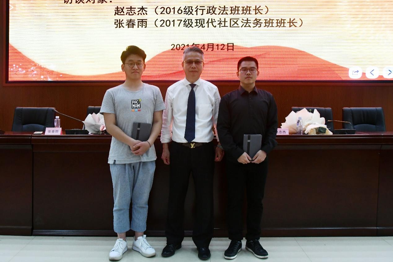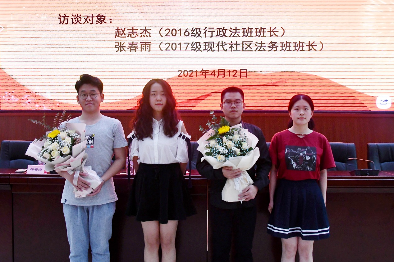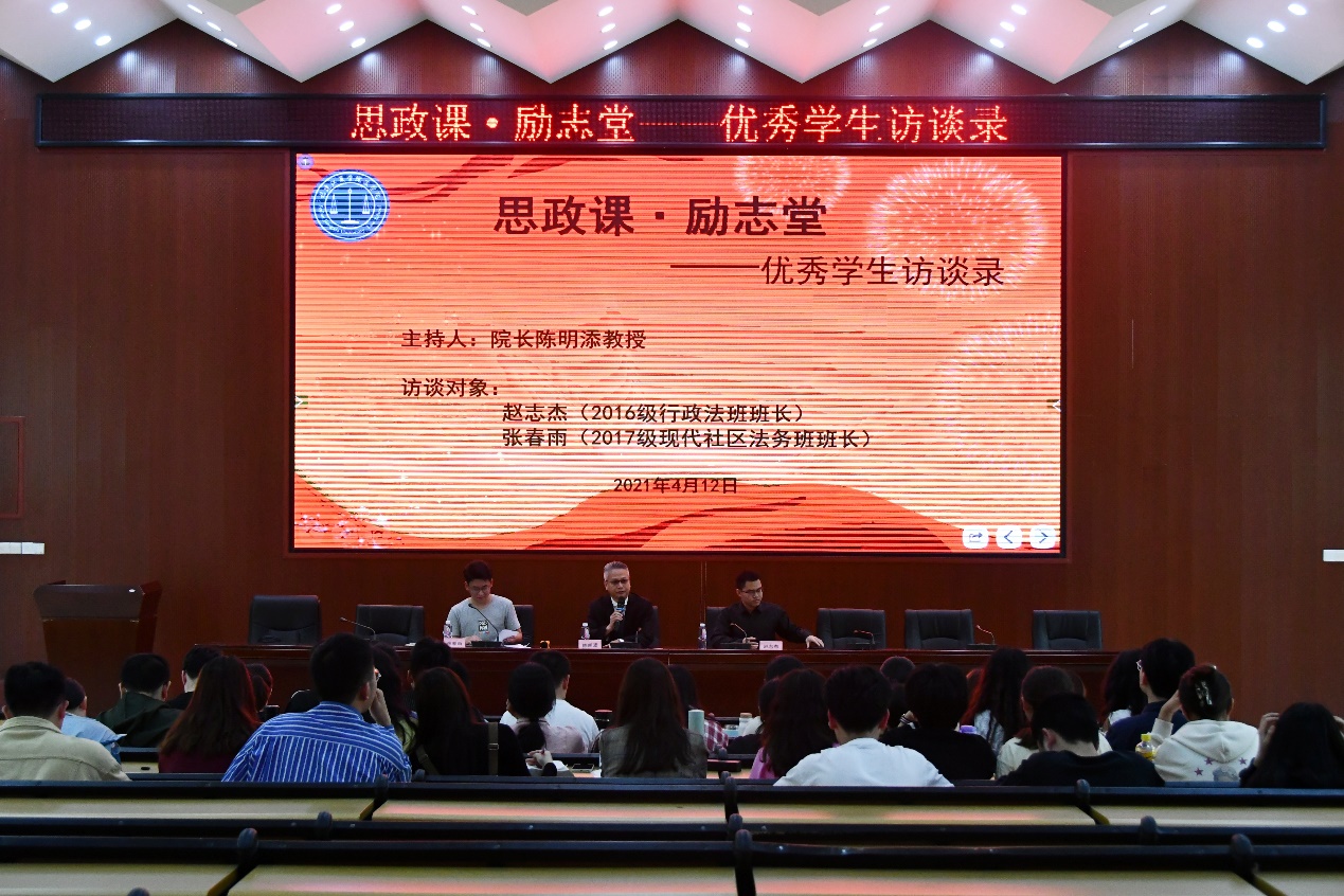 4月12日下午,法学院举办思政课•励志堂——优秀学生访谈录经验分享会。此次大会由法学院院长陈明添教授主持,2016级行政法班班长赵志杰、2017级现代社区法务班班长张春雨主讲,法学院部分学生到场聆听。