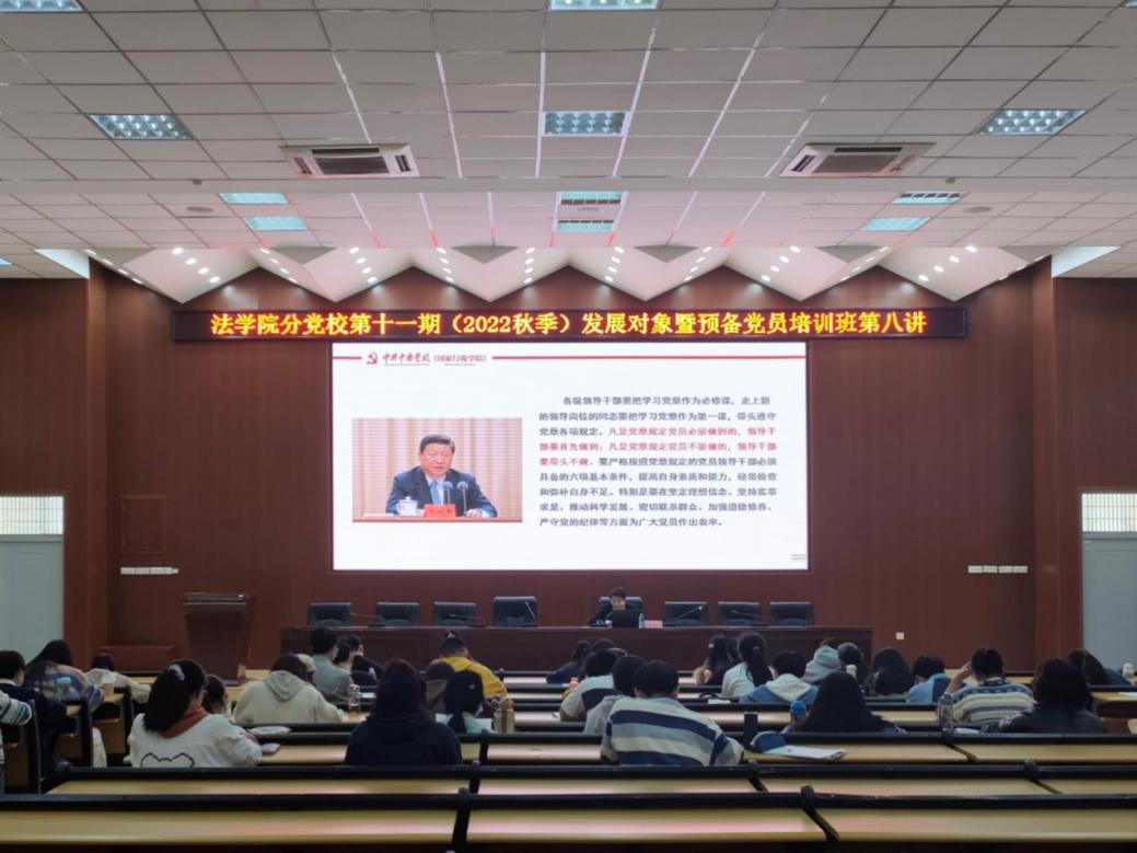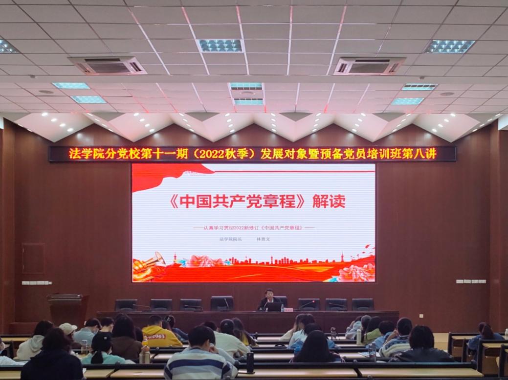 11月24日,法学院院长林贵文教授在教学楼7B206上题为《二十大党章新点亮点解读》的主题党课,对《中国共产党章程》进行深入解读。党章修正案充分体现党的二十大精神,体现新时代党的工作和党的建设的新鲜经验,是我们扎实做好党的各项事业的总纲领。发展对象和预备党员、各支部支委、2019级刑事法班党支部学生党员共76人参加党课。