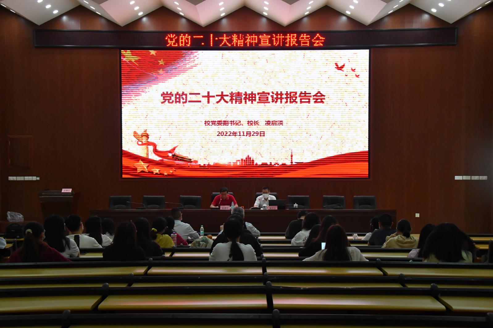 11月29日下午,校党委副书记、校长凌启淡为法学院学生第二党支部宣讲党的二十大精神,法学院学生第二党支部师生参加宣讲会,法学院党委书记张湖北主持会议。