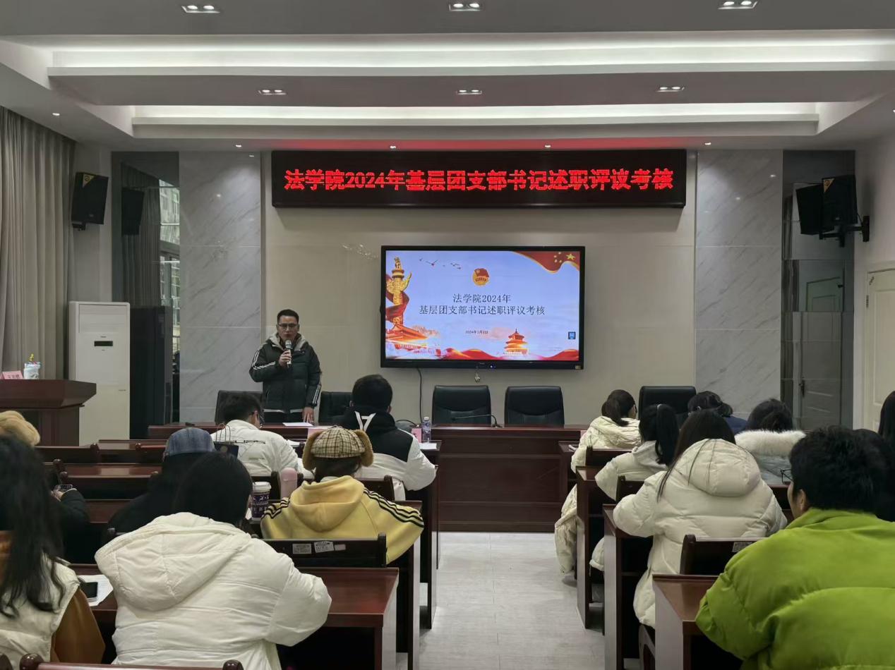 为深入学习贯彻习近平新时代中国特色社会主义思想和党的二十届三中全会精神,积极响应团的十九大部署,进一步加强和巩固团的基层组织建设,1月2日,法学院团委组织开展2024年度基层团组织书记述职评议会议,学院党委副书记谢锦炜出席会议,各年级辅导员参加会议并担任现场评委,本次会议由学院团委负责人黄礼锵主持。