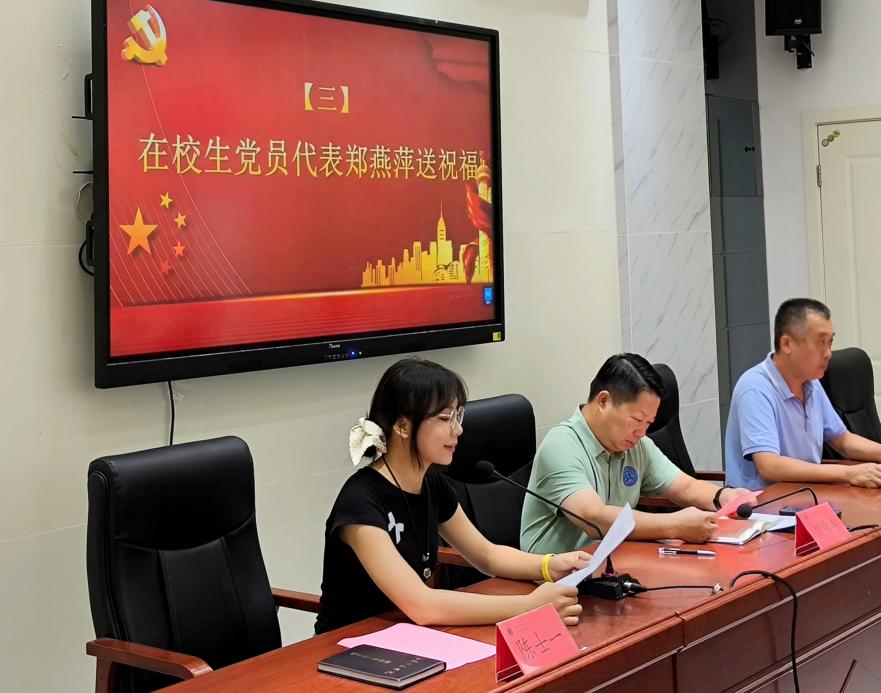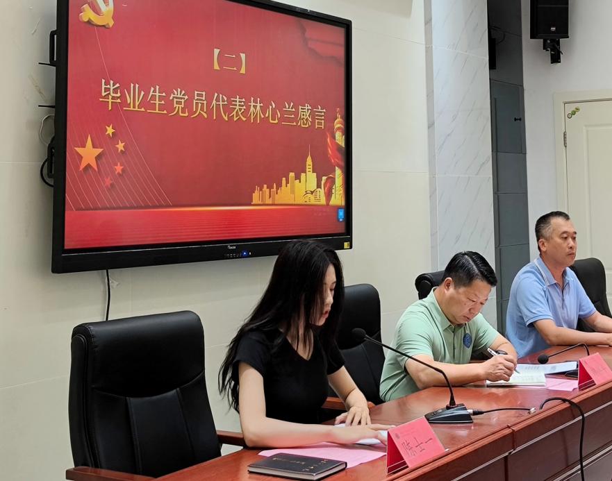 毕业生党员代表林心兰和在校生党员代表郑燕萍依次发表感言,号召毕业生党员以廉洁自律践行法治强国使命承诺。