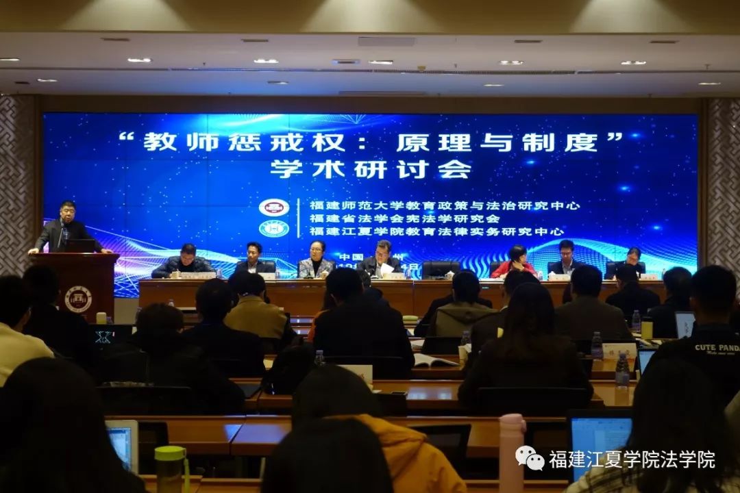 2019年12月14日,教育法律实务研究中心与福建师范大学法学院教育政策与法治研究中心、福建省法学会宪法学研究会联合主办的“教惩戒权:原理与制度”学术研讨会在福建师范大学召开。来自中国政法大学、中国社科院大学、厦门大学、福州大学、湖南社科院、河南财经政法大学、江苏社科院 、福建师范大学、福建江夏学院等单位的专家学者及中学教师、律师等实务领域代表参加了研讨会。福建省教育厅政策法规与行政审批处处长王越忠出席了研讨会开幕式。