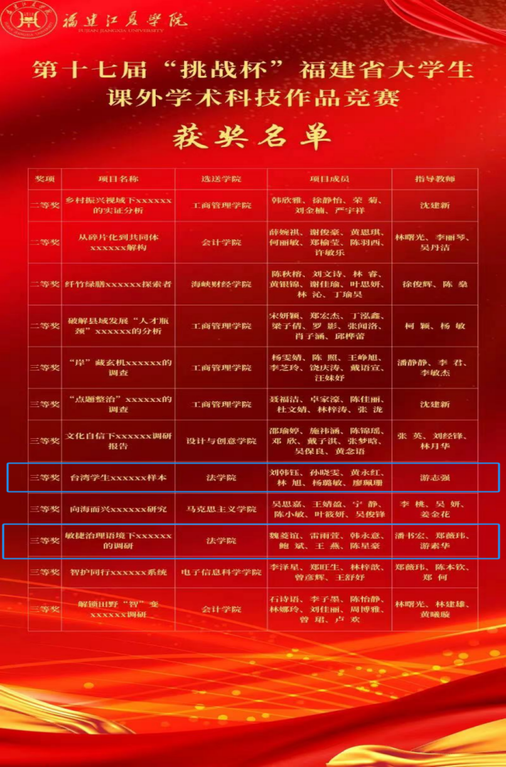 本届大赛共吸引全省1850件作品参赛。经省赛初评、复评层层筛选,163件作品进入终审决赛。由中心成员游志强副教授指导的《台湾学生在祖国大陆就读现状调研报告——以福建省19所高校1041个台生为研究样本》以及潘书宏副教授等人指导的《“未成年人的保护和预防犯罪”专题调研》等2项作品凭借扎实的专业知识与创新实践能力,在激烈竞争中脱颖而出,斩获福建省省赛三等奖!
