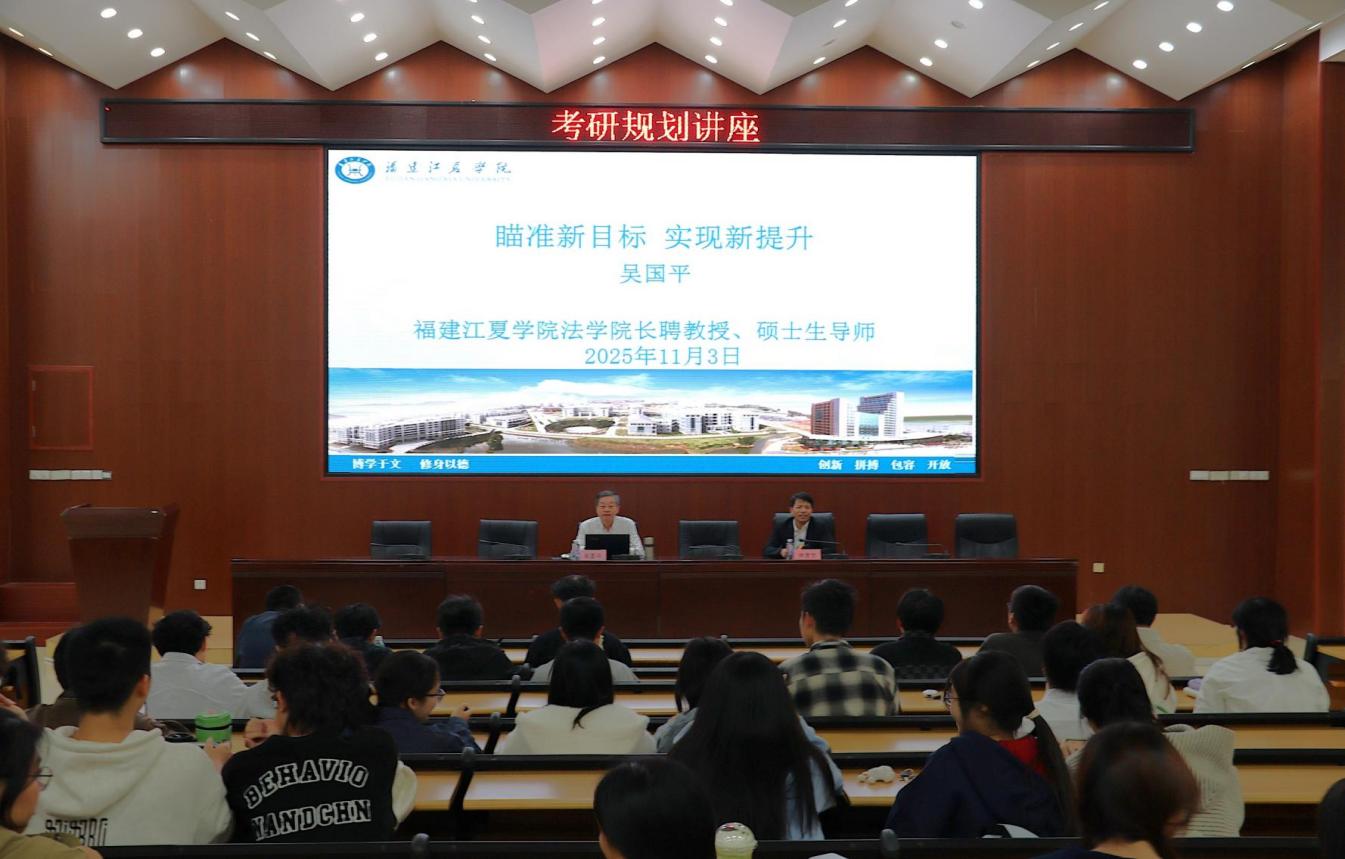 11月3日下午,法学院在7B206举办以“瞄准新目标,实现新提升”为主题的考研规划讲座。校学术委员会主任委员,家事法研究院院长吴国平教授受邀主讲,法学院院长林贵文教授主持,2025级法学(财经法)全体同学到场聆听。